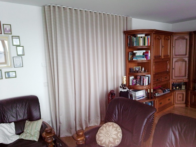 Wärmeschutzvorhang zum Flur auf Wellenband an Alu-Deckenschiene, links Retoure gebogen.